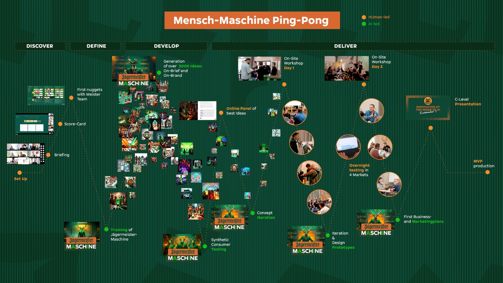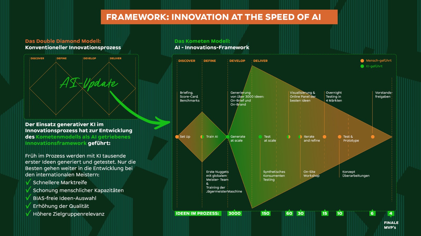 Das Ergebnis: 3000 entwickelte und kuratierte AI-Ideen, 12 Overnight-Konzepttests in 12 Märkten, 9 Business Cases als Projektergebnis – mit 4 innovativen neuen Produkten, die schon kurz darauf in Produktion gingen.